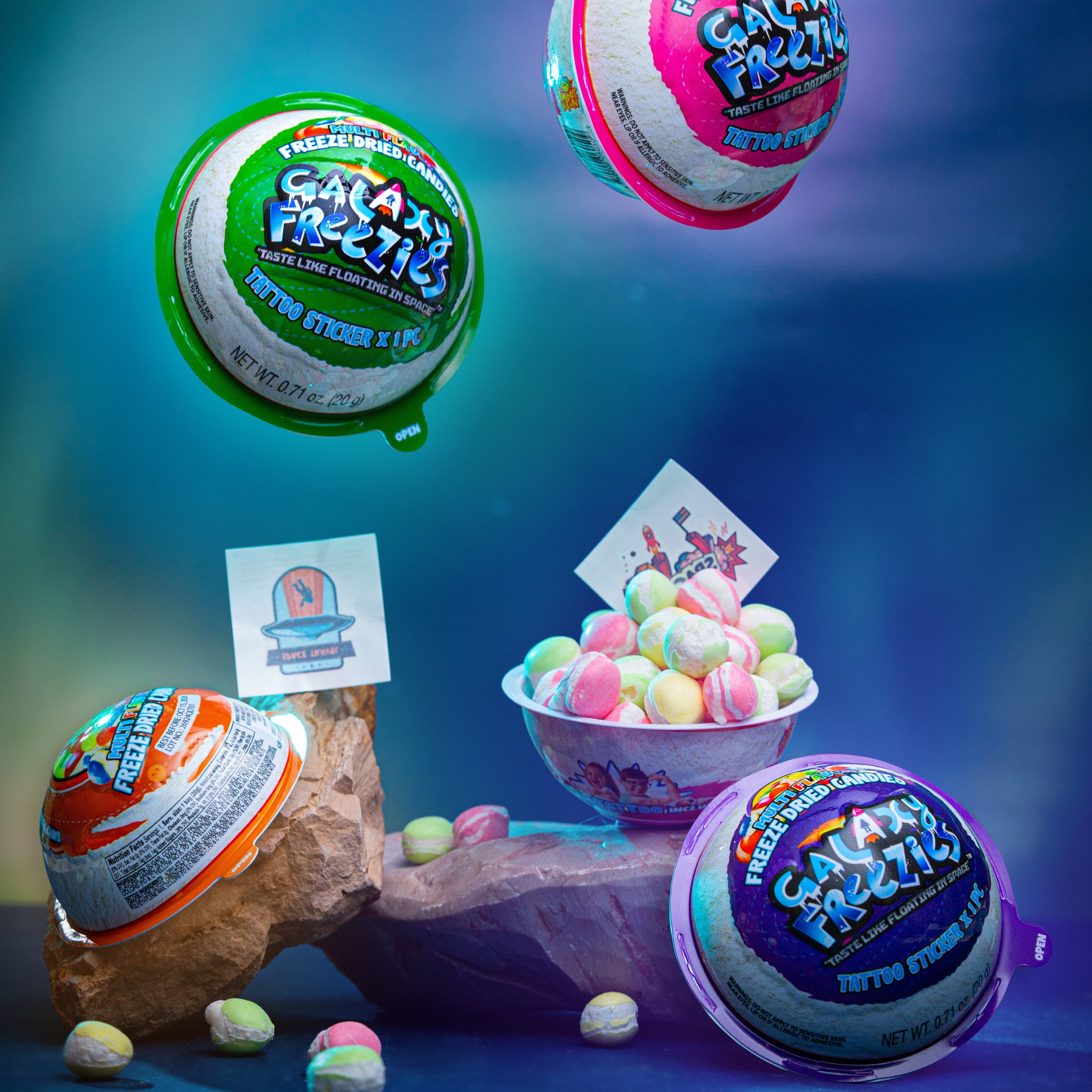 Blast off into flavor with our Galaxy Freezies Meteor Surprise! Each ball is shaped like a freeze-dried candy, crack it open to discover a collectible tattoo...